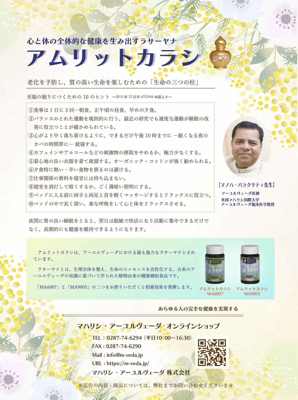 以下は、超越瞑想を学んだ会員に向けて送られる会報、月刊ユートピアの裏表紙に掲載されたアムリットの紹介記事です。(2024年3月号)